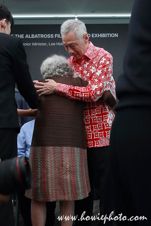 7 Dec 2025 SM Lee Hsien Loong embraces Mdm Huang Kek Chee, widow of Mr Jek Yeun Thong, former PAP Old Guard Minister, at the launch of the Albatross File Book and Exhibition at the National Library